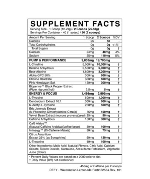 DEFY pre-workout is our strongest stimulant based pre-workout with clincally dosed pump and performance features.