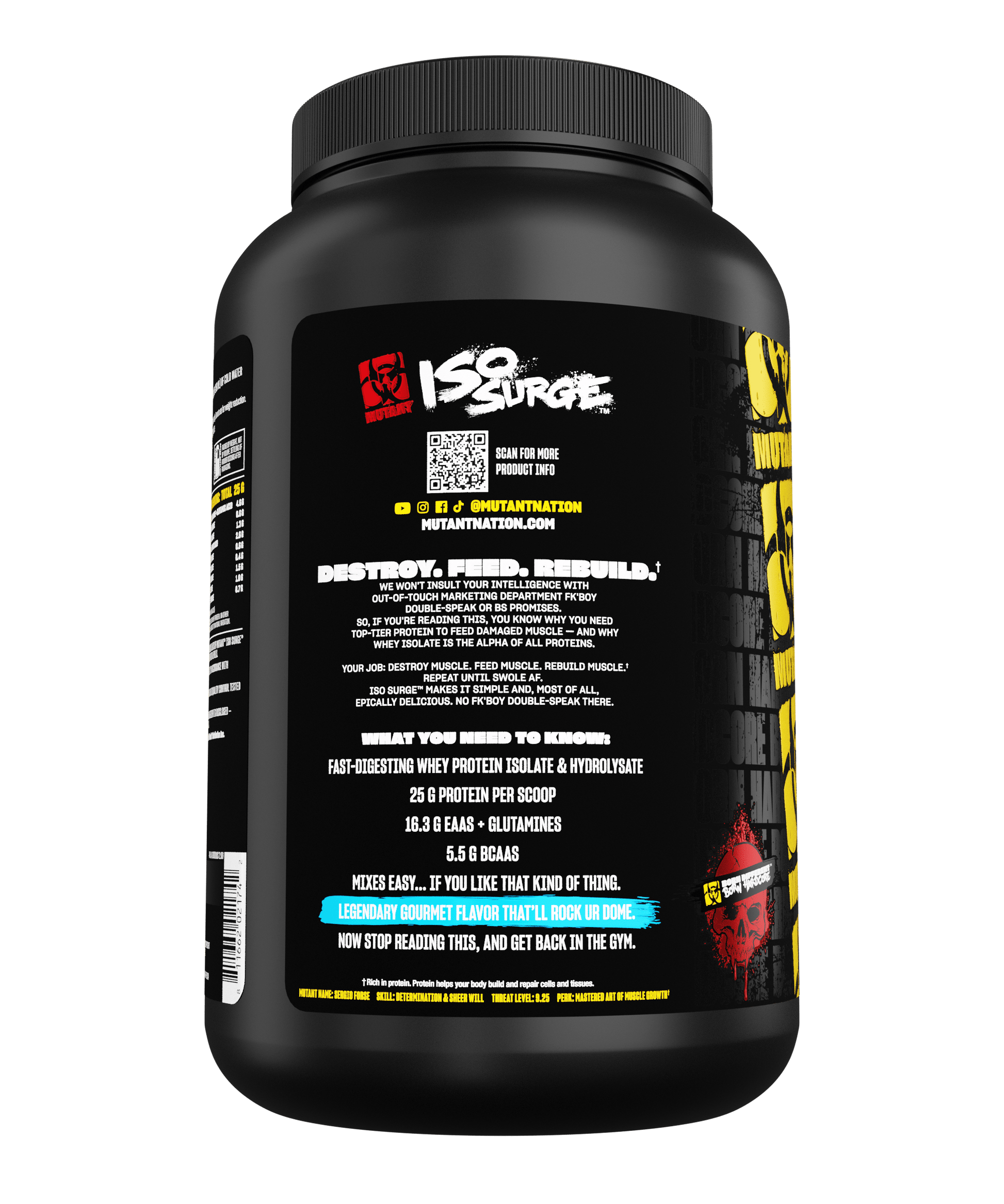 We've set the bar very high with MUTANT ISO SURGE. Premium quality ingredients, mixed with the custom gourmet flavors we've created. You want the best to taste the best...You got it. MUTANT NATION wouldn't accept anything less.